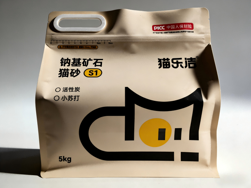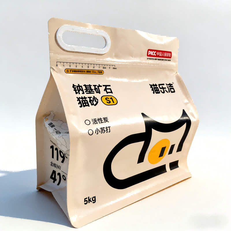 Pussin rakenne: Kahdeksanpuoleinen tiivisterakenne tarjoaa pystysuoran, vakaan muodon, joka on täydellinen hyllyn esittelyyn. Uudelleensuljettava vetoketju ja vahvistettu muovinen kädensija mahdollistavat 5 kg:n kissanhiekan helpon käsittelyn ja turvallisen säilytyksen.